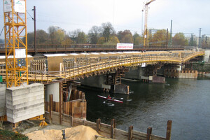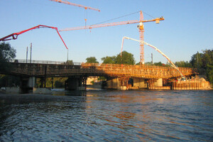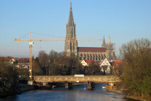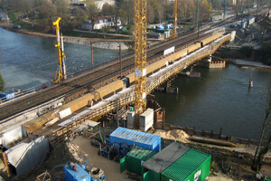 Im Zuge der Bauarbeiten für den neuen, tiefergelegten Bahnhof von Neu-Ulm wurde die Bahnbrücke über die Donau von zwei auf vier Gleise verbreitert.