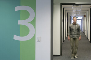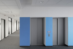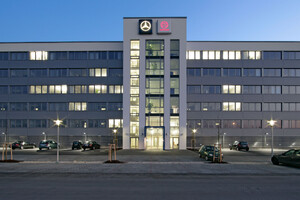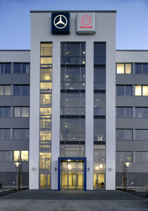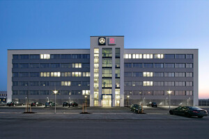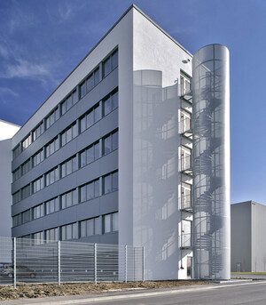 Nach dem Bau des hochmodernen Ersatzteil-Logistikzentrums wurde am gleichen Standort ein fünfgeschossiges Verwaltungsgebäudes als direkter Anschlussauftrag für die Evobus GmbH realisiert. Das Verwaltungsgebäude mit einer Nutzfläche von rund 6.000 Quadratmetern wurde von Schmid in nur 9 Monaten Bauzeit realisiert und zeichnet sich mittels modernster Haustechnik durch eine hohe Energieeffizienz aus. Die Aufgabenstellung bestand darin, ein repräsentatives Bürogebäude zu errichten, das einen möglichst geringen Energiebedarf aufweist, und gleichzeitig ein behagliches Raumklima bietet – im Sommer wie im Winter.Lösung: Flächentemperierung und regenerative ErdwärmeDer Bauspezialist Schmid überzeugte den Bauherren von einem ganzheitlichen Gebäudetechnik-Konzept, basierend auf dem Einsatz einer energieeffizienten Flächentemperierung auf Grundlage erneuerbarer Energiequellen. Die Energie für das Beheizen und Kühlen des Gebäudes erfolgt über eine Wärmepumpe, welche Grundwasser als Energiequelle nutzt. Somit bezieht das Gebäude regenerative Energie für Heiz- und Kühlzwecke auf umweltschonende Weise. Zudem ist das System äußerst wirtschaftlich: Lediglich zum Antrieb der Wärmepumpe wird elektrische Energie benötigt, 80 Prozent der Energie wird hingegen kostenlos aus der Umwelt bezogen. Die Verteilung der Energie basiert auf einem intelligenten Flächentemperierungs-System. Im Bürohaus wurden hierzu Stahlbetonfertigteile mit integrierten Rohrleitungen in die Geschossdecken installiert. Dieses thermoaktive CON-4-Bauteilsystem, das in enger Zusammenarbeit mit dem Baustoffwerk Rudolph umgesetzt wurde, sorgt in den Büroräumen ganzjährig für ein optimales Raumklima. Je nach Heiz- oder Kühlbedarf lässt die Wärmepumpe warmes oder kaltes Wasser durch die Rohrleitungen zirkulieren, wodurch die Decken und damit die Innenräume stets optimal temperiert werden. Die gleichmäßige Strahlungswärme, die in der kalten Jahreszeit von der Flächenheizung ausgeht, wird als besonders angenehm empfunden und erzeugt auch keine Luftverwirbelungen und Zugluft.