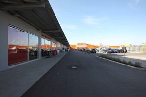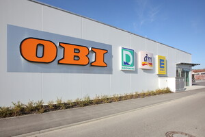 Neubau eines Fachmarktzentrums mit fünf Verbrauchermärkten - OBI, Deichmann, DM, Edeka und AWG.