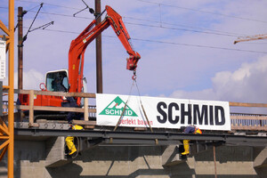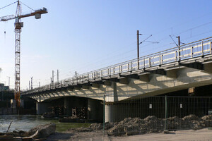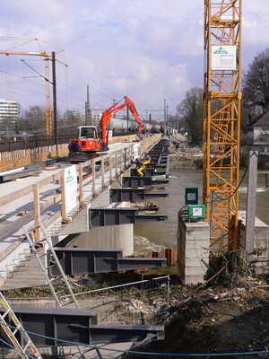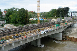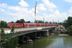 Im Zuge der Bauarbeiten für den neuen, tiefergelegten Bahnhof von Neu-Ulm wurde die Bahnbrücke über die Donau von zwei auf vier Gleise verbreitert.