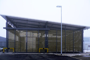 Ausführung einer Stahlkonstruktion als Überdachung des Müll-Sammelplatzes mit elektrischen Schiebetoren. Verkleidung der Stahlkonstruktion mit Holzlamellen.